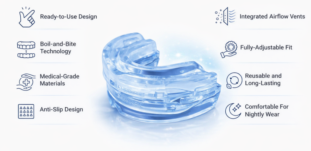 Quick 3-minute custom fit with advanced boil-and-bite technology Precision-adjusted to support proper airflow Supports relief from mild to moderate sleep apnea symptoms Ultra-comfortable fit that stays in place throughout the night